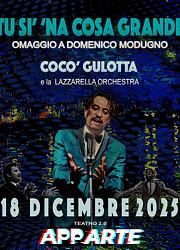 "Tu sì 'na cosa grande” è uno spettacolo teatrale-musicale dedicato a Domenico Modugno e nato dal desiderio di omaggiare lo straordinario repertorio del grande Artista pugliese a trent’anni dalla sua scomparsa. Cocò Gulotta, attore e cantante, lo interpreta e ne cura il testo e la regia accompagnato da un ensemble di musicisti di straordinaria qualità. Lo spettacolo è un appassionato tributo a Mister Volare e ai suoi grandi successi che utilizza la forma del Teatro-Canzone (nello stile artistico di C.Gulotta) per ripercorrere alcuni momenti salienti della vita d Mimì Modugno e regalare al pubblico una selezione del vastissimo repertorio musicale dell'Artista salentino. Da “La sveglietta” a “ La lontananza”, da “ U' pisci spada” a “Tre somari e tre briganti” (tratto dalla commedia musicale Rinaldo in campo di Garinei e Giovannini) fino a “Vecchio frack” e “Meraviglioso” (per citare solo alcune canzoni), Gulotta si cimenta con disinvoltura ed ottime qualità canore con più di venti brani tra quelli che hanno segnato un’epoca. Canzoni destinate a rimanere per sempre nell'immaginario collettivo. Non solo un concerto, quindi, creato in onore del cantautore di Polignano a Mare, ma un vero e proprio spettacolo divertente e coinvolgente sul filo della poesia popolare, della musica folk e dell'amore per i suoni antichi (mandolino, arpa, chitarre, tamburi, tamburelli, etc.) arricchito da rapidi cambi di costume e divertenti trovate sceniche. Due irresistibili ore di viaggio nell'universo fantastico di Modugno per ridere, cantare e commuoversi nel seguire la magica storia di un semplice e geniale ragazzo del Sud alla ricerca del suo sogno “meraviglioso”.
